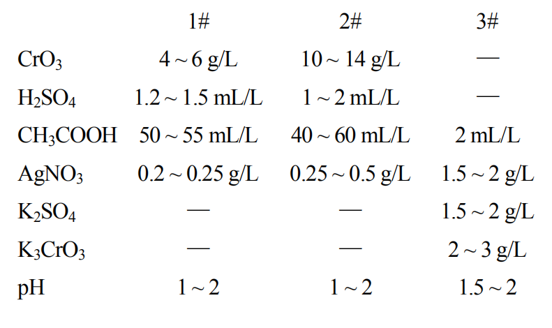 排除方法:稀釋鈍化液至pH達(dá)1~2時,再按照稀釋時用去的水量來補(bǔ)充CrO3、AgNO3及CH3COOH。